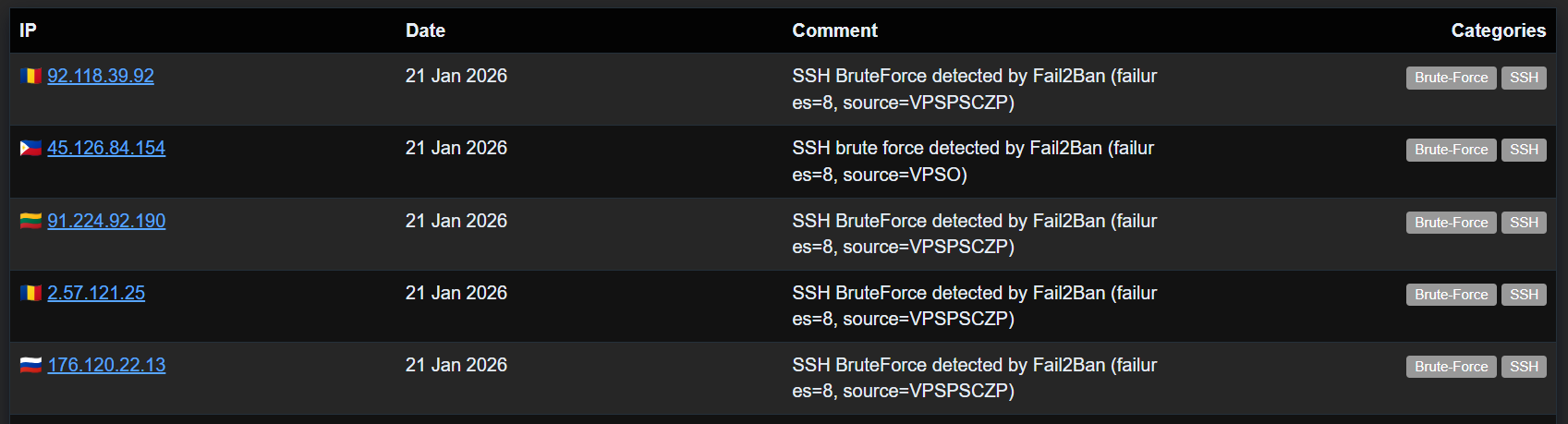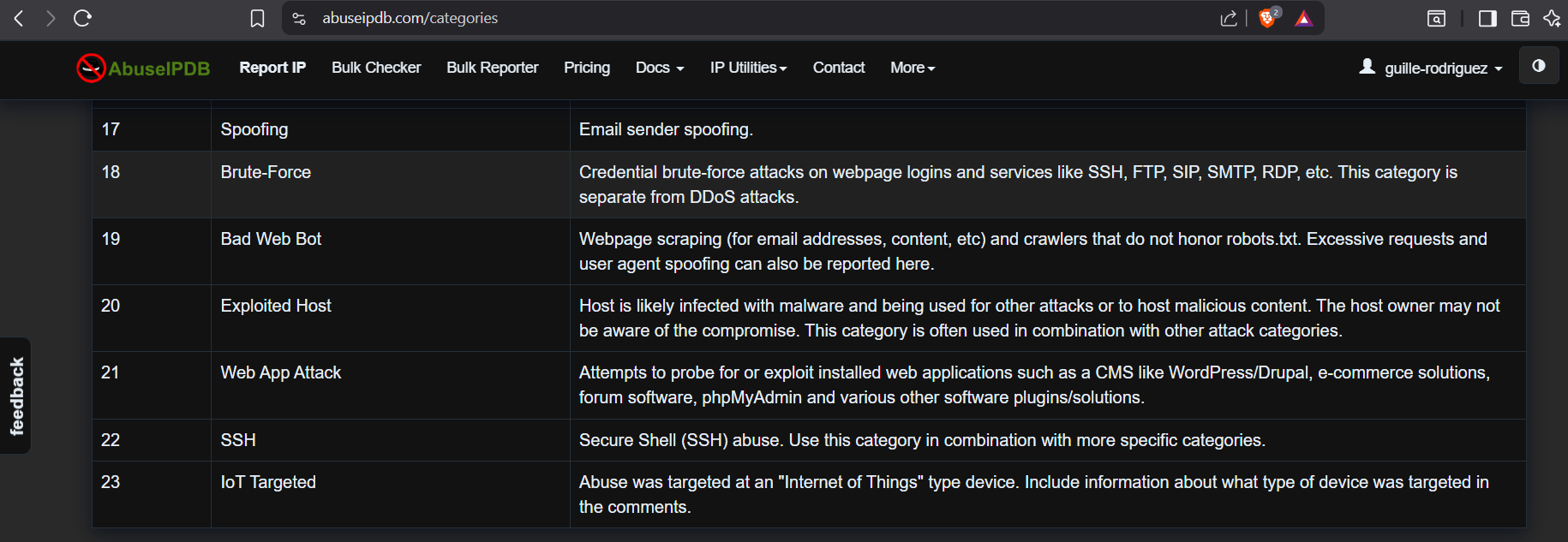 Y te preguntarás, que son el número 18 y 22 que hay en abuseipdb_category="18,22"? Tengo que poner eso siempre? Bueno pues son las categorías de AbuseIPDB https://www.abuseipdb.com/categories. Para SSH recomiendan poner esas, pero para otros servicios, obviamente deben cambiarse.