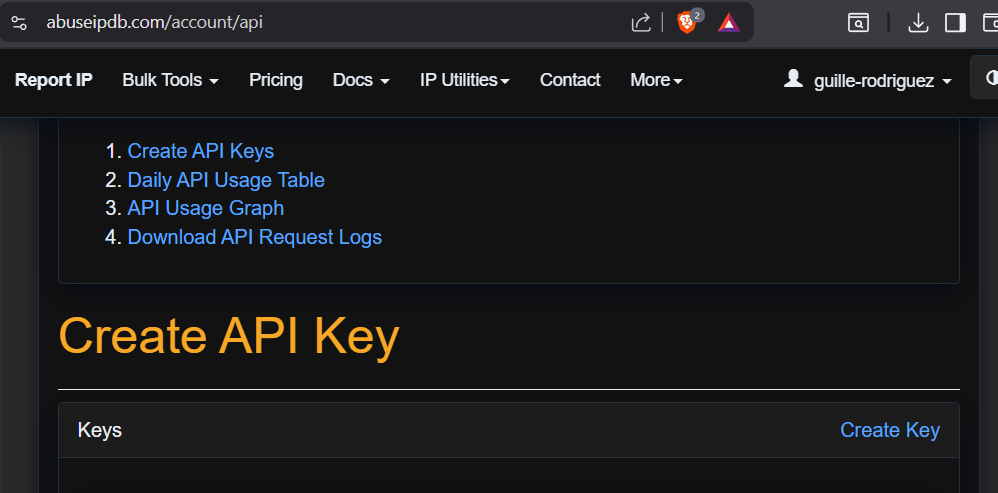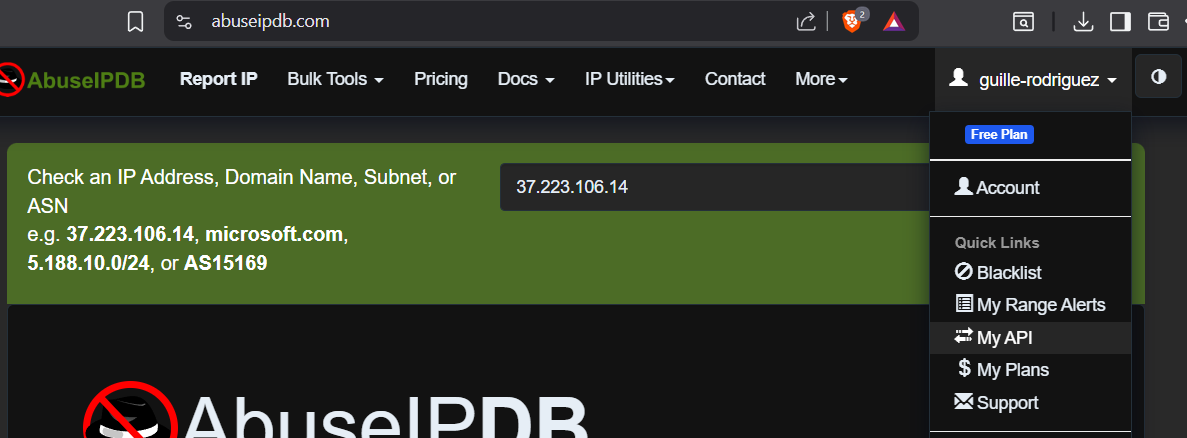 Accede a AbuseIPDB, create una cuenta si no dispones de ella y posteriormente entra en la sección de API