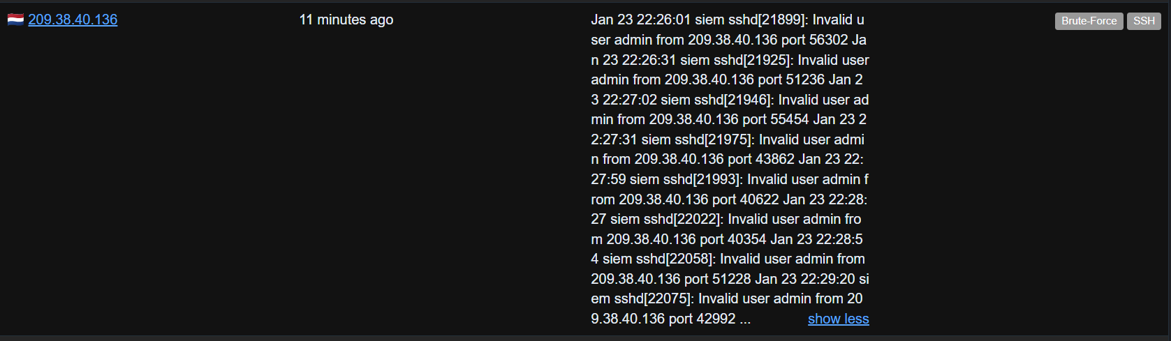 Ahora queda a esperar a que un bot comience a intentar realizar un ataque de fuerza bruta, almenos 8 intentos (maxretry=8) para que Fail2ban decida que se banea esa IP y queda reportada en AbuseIPDB.
